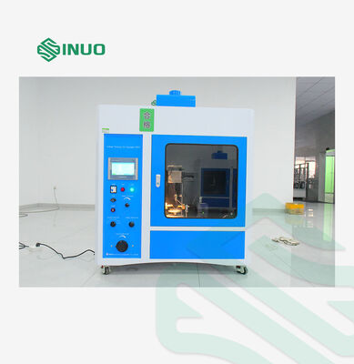A gauge block is supplied with the instrument to ensure the electrodes have the proper distance between them. The table height is easily adjustable to ensure the proper angle of the electrodes and height of drops. The rest of the test is controlled from outside the test chamber with the door closed. The voltage, limiting current, drip rate and number of drips are all set on the control panel. An operator should observe the test to see if a flame ignites. The instrument sounds an alarm if there is a tracking failure of at least two seconds.